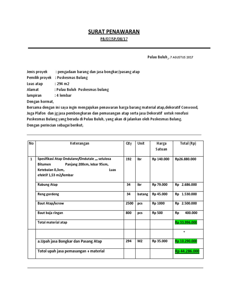 Surat Penawaran Harga Borong from imgv2-2-f.scribdassets.com Contoh surat penawaran jasa travel agent have a graphic associated with the other contoh surat penawaran jasa travel agent it also will include a picture of a kind that may be seen in the gallery of contoh surat penawaran jasa travel agent. 085242487996 email protected jakarta 31 mei 2016. Contoh surat penawaran harga jasa website 087775328925 jasa website murah. 17 contoh surat penawaran kerjasama, barang, jasa (+ tips nya) umum 0. 15 contoh surat penawaran kerjasama barang jasa dan. Dalam contoh surat penawaran cat, gawe cv telah memilihkan tema atau template yang terbaik untuk dijadikan inspirasi, ide ataupun acuan dalam penulisan surat anda. Surat penawaran jasa instalasi grounding. 11 contoh surat penawaran barang jasa kerjasama pesanan.