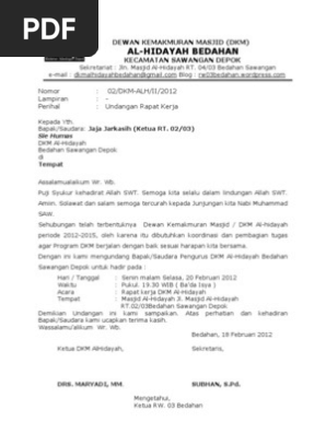 Mungkin kebanyakan dari kita telah mengenal dengan jenis surat yang satu ini. Assalamu'alaikum warohmatullohi wabarokatuh, dalam rangka menyambut tahun baru islam 1 muharam 1436 h, kami mengundang jama'ah masjid/mushola sekalian untuk berkenan menghadiri kegiatan tabligh akbar dengan tema menjadi muslim sejati dan. Di kesempatan kali ini dosenpintar.com akan membagikan artikel mengenai tentang contoh surat undangan yang meliputi. 05 /pmna/x/2012 ganjar agung, 10 oktober 2012lampiran : Identitas pengirim selain beberapa hal penting di atas, beberapa poin yang juga harus diperhatikan ketika menyusun surat undangan rapat ini misalnya. 10th maret 2021 4 min read. Namun tentu saja ada banyak hal yang harus dipersiapkan, baik oleh panitia rapat ataupun dari peserta rapat yang diundang. Download contoh surat undangan pembentukan pengurus takmir masjid format doc ms word bisa diunduh dan edit sesuai dengan hari tanggal tempat serta penandatanganan surat. Muslim muda rt 04 rw 05 desa cinta kasih kec. Doc panitia pemilihan ketua rw 10 dulur farhan academia edu. Rw 5 karanglo karangdukuh contoh undangan rapat pemilihan. Contoh surat undangan resmi mengahdiri acara dibuat dan ditujukan bisa kepada individu atau sebuah kelompok dalam perusahaan sehingga memang biasanya ketua atau kepala sekolah yang di undang tidak bisa hadir disinilah akan di ganti dengan perwakilanya. Rapat dewan kemakmuran masjid merupakan suatu agenda rutin yang pasti ada di setiap masjid, baik itu bertujuan pemilihan pengurus ataupun rapat persiapan kegiatan.
